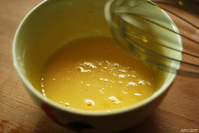 6. heat the milk and, just before boiling, slowly add to the egg-yolk mixture and beat this mixture also au-bain-marie until thickened (i nearly botched it up here, left the bowl with egg-yolk mixture over the hot water while i went on to prepare something else, and it nearly became a steamed omelet!... so watch it and remove from heat as soon as thickened)