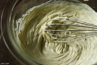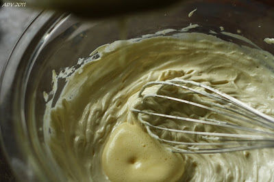 7. mix the egg-yolk mixture with the cream cheese mixture (i was able to save the whole thing by running it thru a fine-mesh sieve, yay)